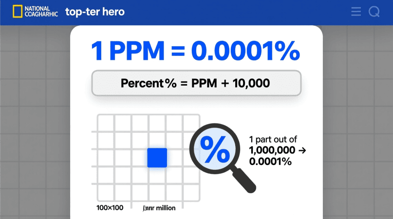 Convert 1 ppm to percent (0.0001%) in one step. Learn what parts per million means, how ppm relates to percentage, and where 1 ppm concentration is used in chemistry, water testing, and agriculture on PPMCalculator.