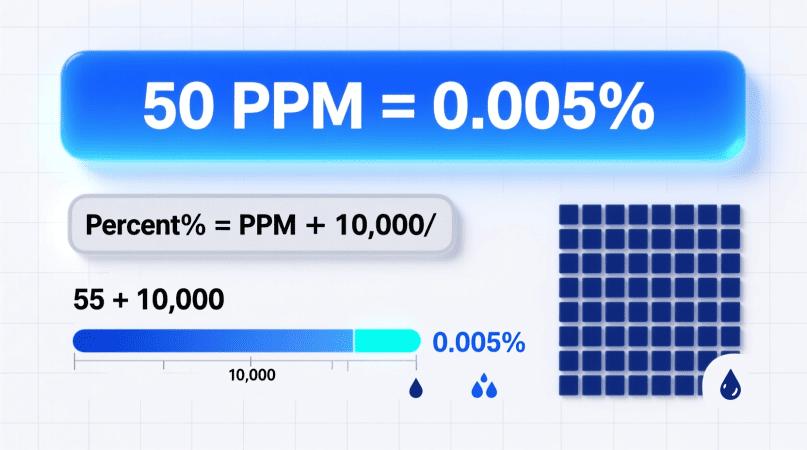 - In manufacturing or lab calibration: 50 ppm impurity equals 0.005% — a small, but measurable, concentration that could affect product quality. Learn how labs measure this in the How to Calculate PPM in Chemistry guide.
