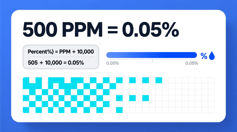 Convert 500 ppm to percent (0.05%) easily. Learn what ppm means, how to calculate it, and how ppm relates to percentages in water, fertilizer, and chemistry at PPMCalculator.