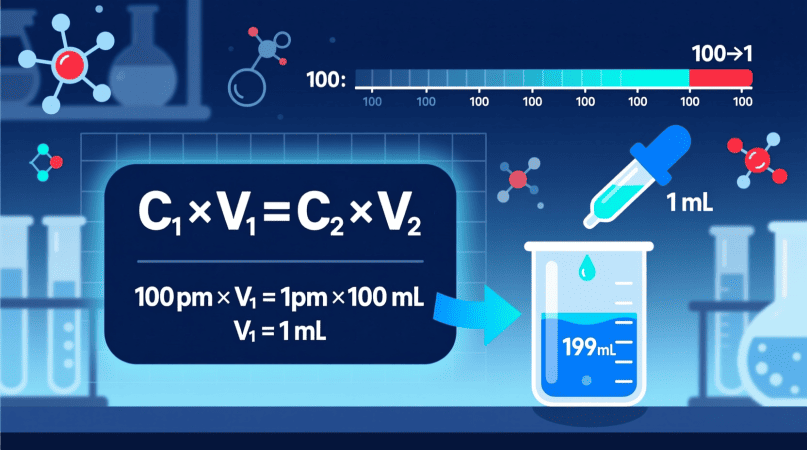 This process is called serial dilution — a precise method used to create lower concentrations from a higher one. In this guide, we’ll walk through the formula, calculations, and steps to make a 1 ppm solution from a 100 ppm solution safely and accurately.