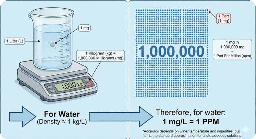 For water and dilute aqueous solutions: 1 mg/L=1 mg per 1,000,000 mg=1 PPM