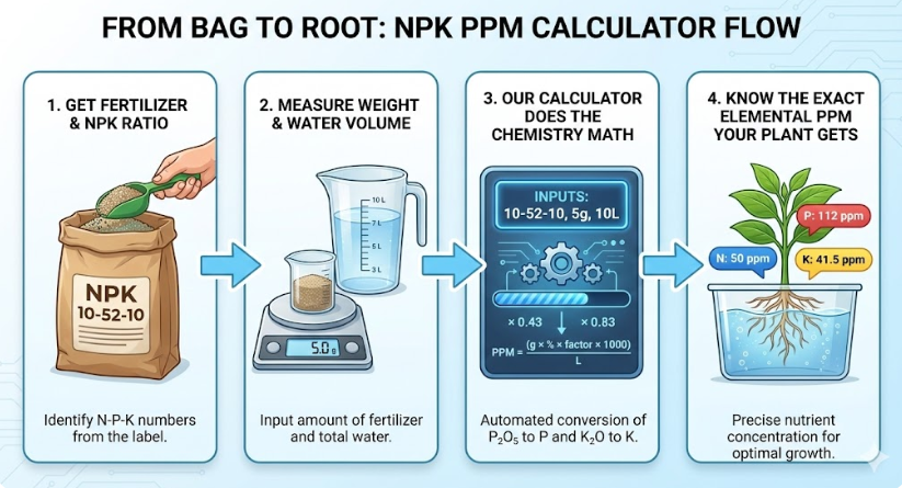 The calculator takes these inputs and, using standard conversion factors, quickly computes the ppm for each of the three macronutrients. This immediate feedback helps you adjust your recipe for optimal plant growth.