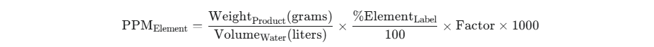PPM = (grams × %element ÷ 100 ÷ liters) × 1000