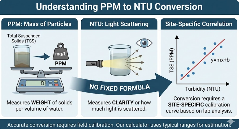 The key takeaway is that PPM measures concentration (mass), while NTU measures an optical property (light scattering). This is why a simple, direct conversion is not possible.