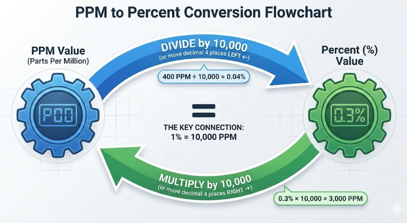 Percent = PPM ÷ 10,000 - To convert percent to PPM: